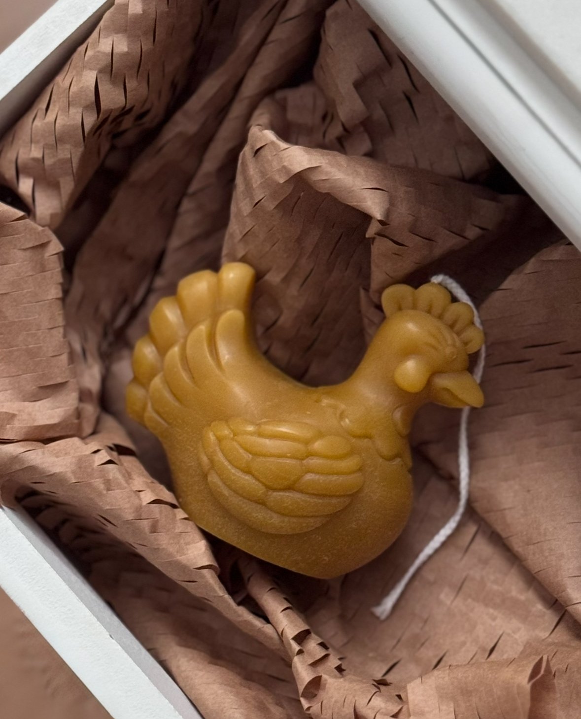 A small, golden hen shaped from pure beeswax, this candle brings a sense of warmth, care, and quiet charm into any space. Hand-poured and naturally honey-scented, it carries the soft glow and subtle aroma only real beeswax can offer—clean-burning, long-lasting, and free from anything unnecessary. The gentle detailing gives it a folk, almost heirloom feel, making it as beautiful unlit as it is when glowing. Thoughtfully packaged and made to be kept, gifted, or lit on a slow evening, this HEN candle is a simple object with a lot of soul.