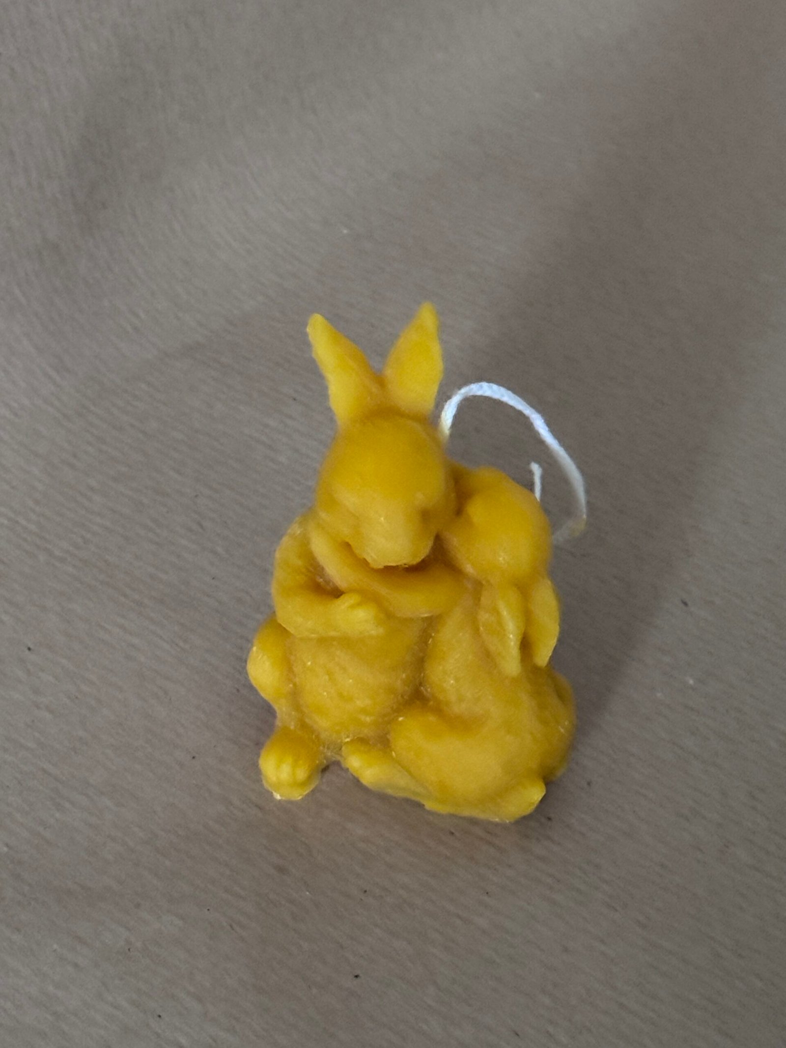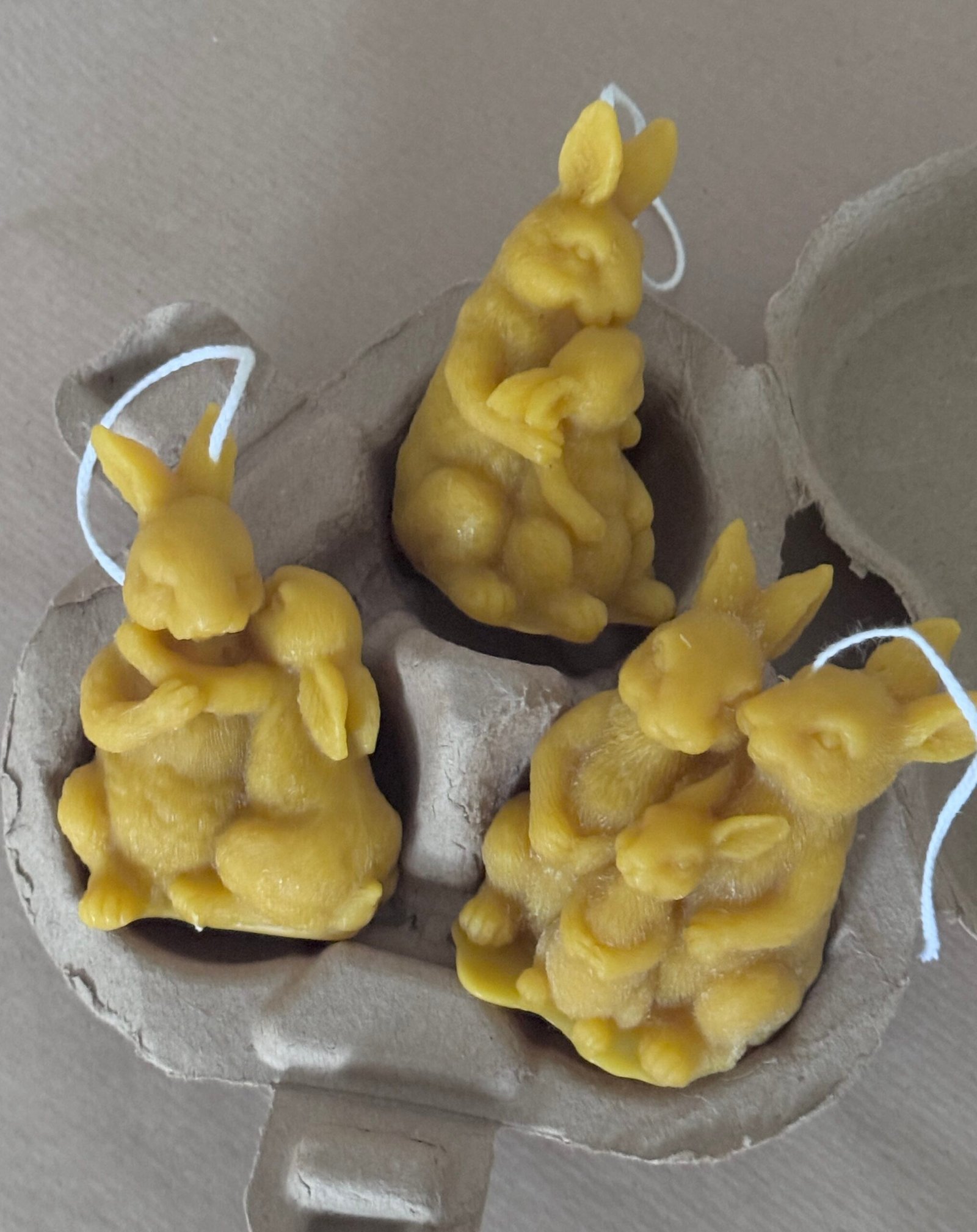 This delicate beeswax candle features a serene bunny mother hugging her baby in 2 designs . Crafted entirely from natural beeswax, the candle showcases fine hand-sculpted details. The warm honey tone of the wax adds a cozy, rustic charm, making it a perfect accent for springtime décor, baby showers, or Easter tablescapes.