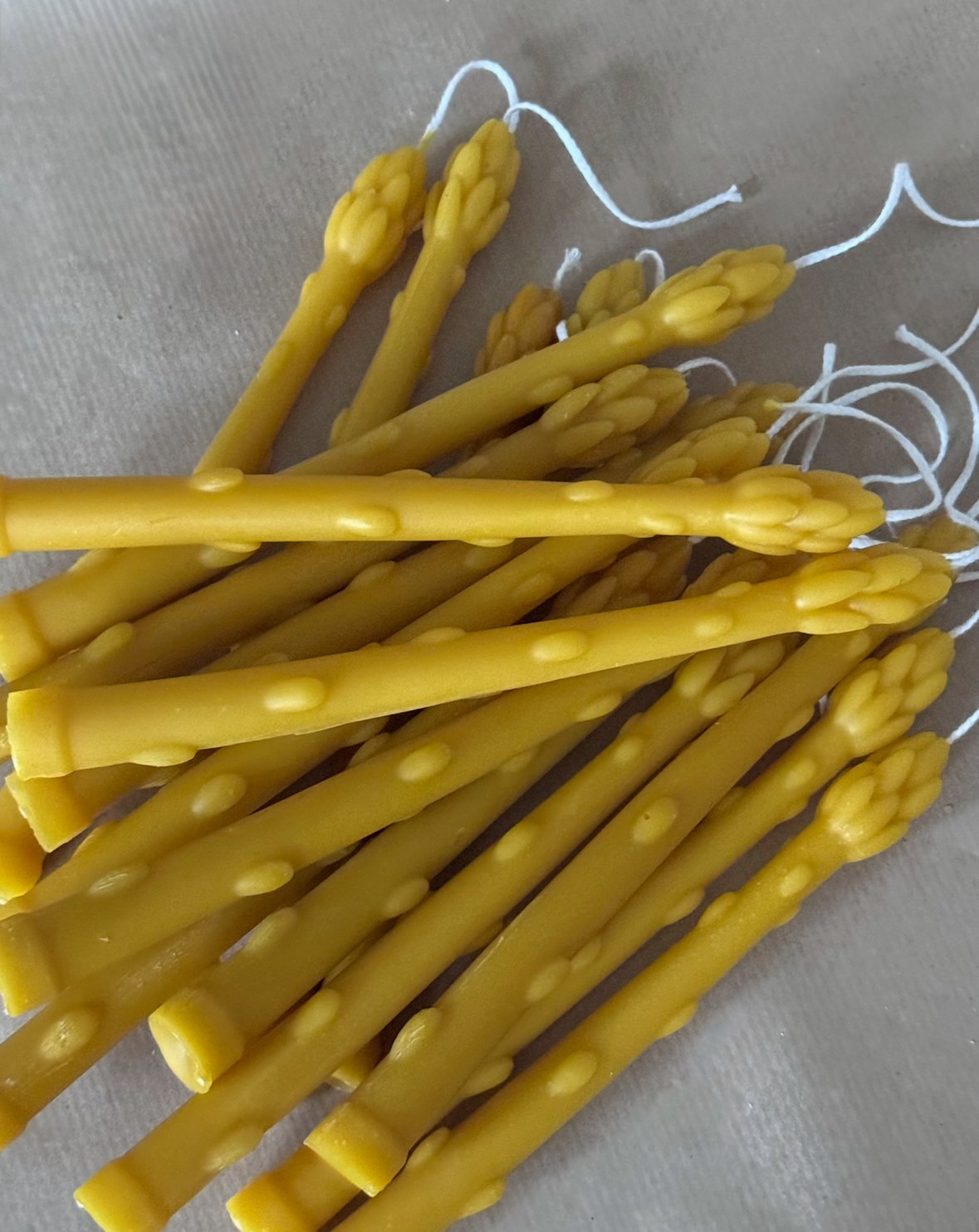 A playful twist on classic tapers, this set of three asparagus-style beeswax candles brings charm and character to any rustic or farmhouse-inspired space. Hand-poured in small batches using 100% pure beeswax, each candle has a natural golden hue and a subtle, sweet scent of honey.