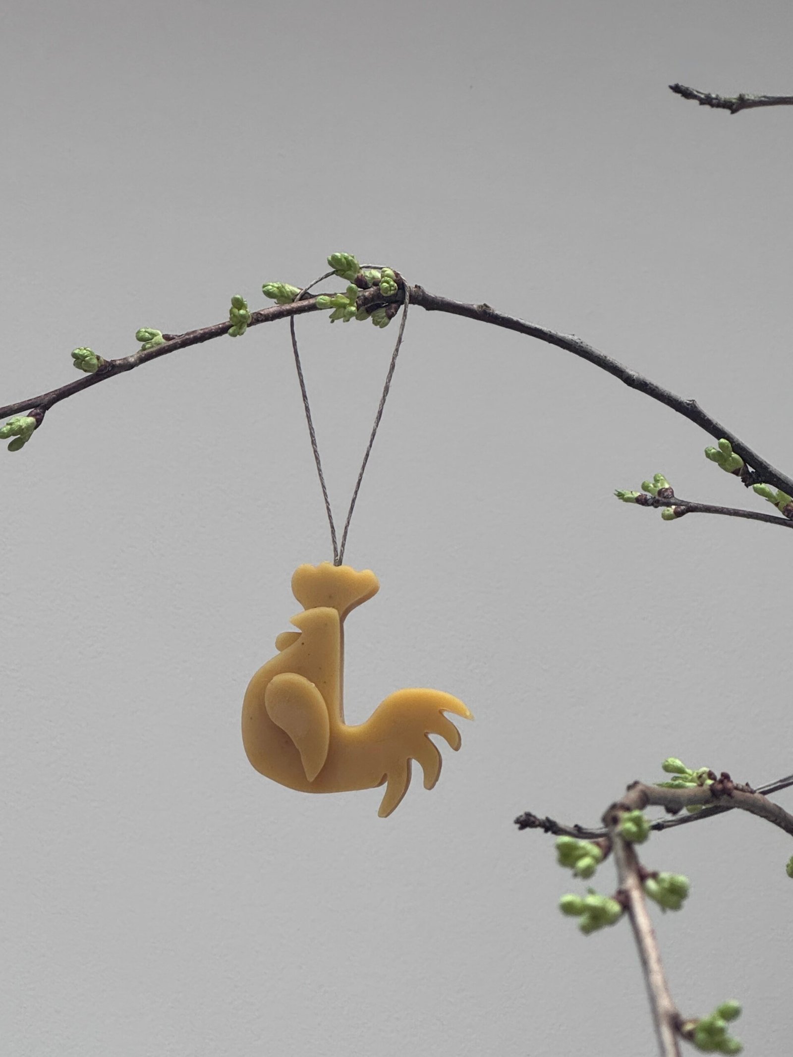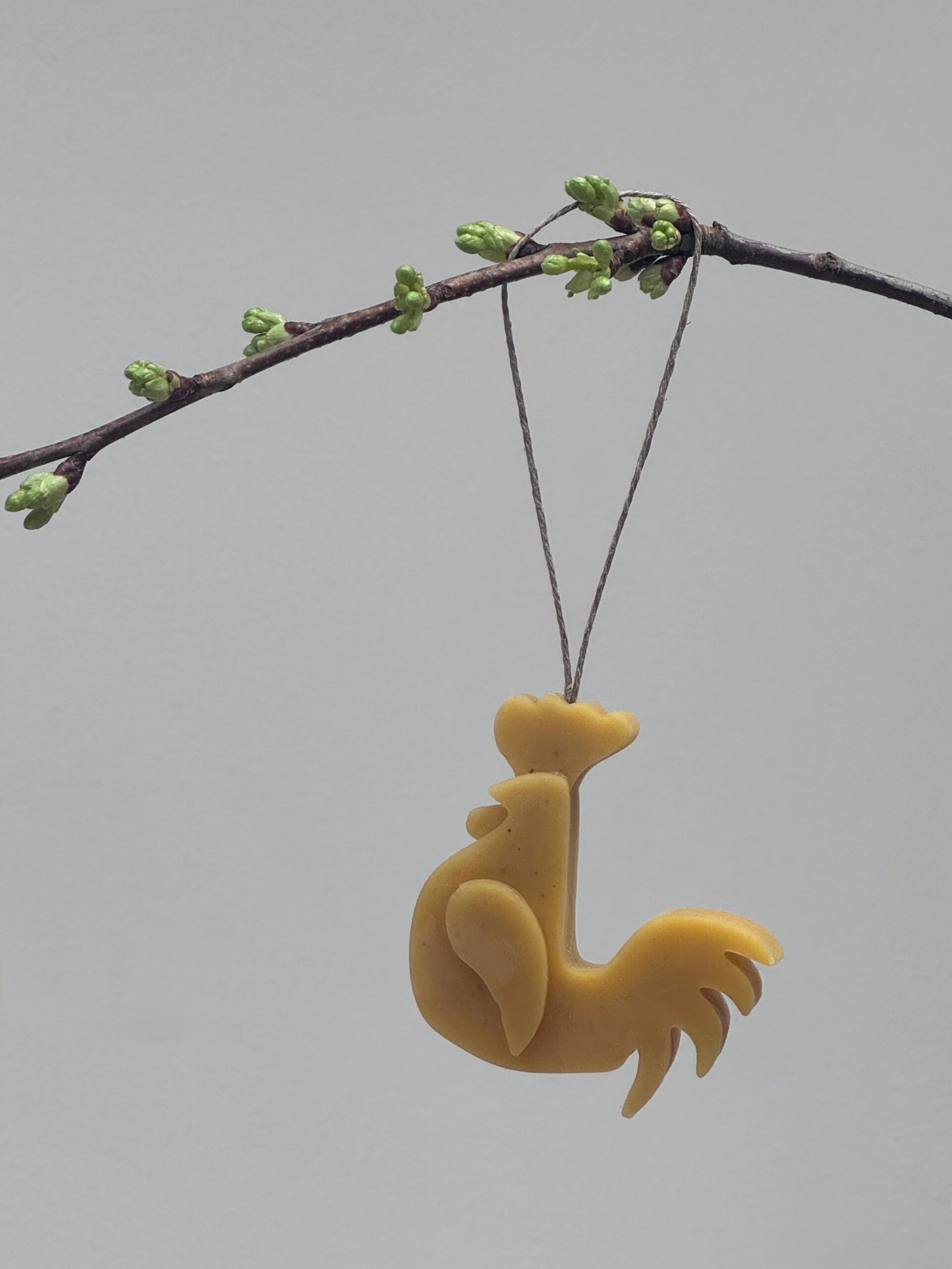 This rooster hanging decoration is handcrafted from natural beeswax, giving it a warm golden colour and a gentle natural honey scent. The simple rooster design adds a charming farmhouse touch and looks lovely displayed on branches, hooks, or as part of a seasonal arrangement. Hung with rustic twine, it’s a small, nature-inspired decoration that brings a cosy handmade feel to any space.